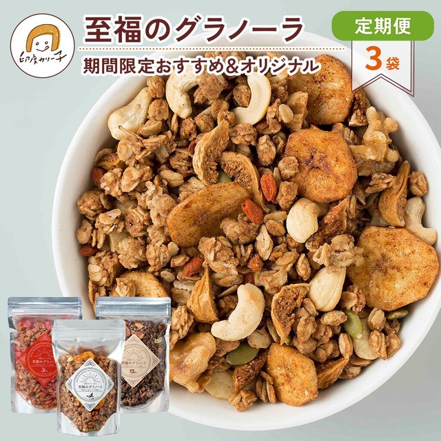 一番人気のオリジナル商品 至福のグラノーラ シナモン&黒糖バナナと期間限定の季節の至福のグラノーラ2種類がセットになった月1定期便です。 ※おまかせ便選択で【送料無料】お届けいたします。 * スパイスのちからをもっと気軽に取り入れてほしい。 そう考えてたどり着いたのが「至福のグラノーラ」。 毎日の健康と美をサポートできるよう原材料を厳選し、ひとつひとつ手作りで丁寧に焼き上げています。 ひかえめの甘さの中に、たっぷり香るスパイスに包まれて幸せな朝を迎えたいあなたへ。 忙しい日でも、癒しの香りで心を満たし、からだに優しい素材で元気に1日をスタートしていただけたら幸いです。 【MIX定期便 お届けスケジュール】 2026年 ・3月 シナモン&黒糖バナナ、【定期便先行特典】シナモン&いちご、シナモン&ショコラ ・4~5月 シナモン&黒糖バナナ、【定期便先行特典】マサラチャイ、シナモン&いちご ・6月 シナモン&黒糖バナナ、【定期便先行特典】カルダモン&素焼きパイン、マサラチャイ ※上記は随時更新されます。 ※定期便は毎月1回3袋セットをお届けします。 ※一時休止・解約希望時、種類変更ご希望時はお問合せからご連絡ください。 ★至福のグラノーラ お試し1個〜は以下より https://indocurry.thebase.in/categories/3478458 ★至福のグラノーラは、全て宮城の社会福祉法人「はらから福祉会」でひとつひとつ丁寧に手作りされ、発送されています。 売上が障害を持つ方の月額賃金と自立支援に繋がっております。厚く御礼申し上げます。