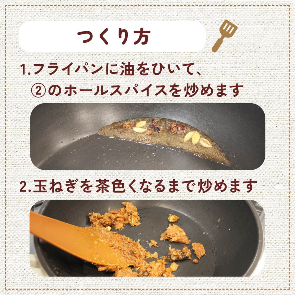 ①香りを引き立てる「ホールスパイス」②味のベース「パウダースパイス」③辛味付の「辛味スパイス」の3点セット。小麦粉不使用でおもくない、からだに優しいカレーが作れます。