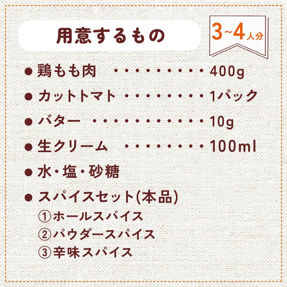 【送料無料】初心者おすすめ!バターチキンカレー スパイスセット 3~4人分 | フライパンひとつで簡単 本格 スパイスカレー 辛さはゼロ〜辛口まで調整可能 小麦粉不使用