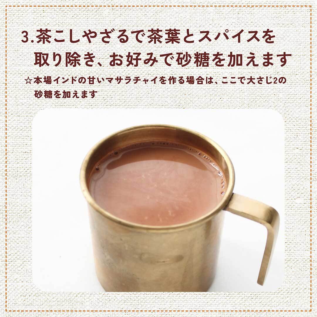 3. 茶こしやざるで茶葉とスパイスを取り除き、お好みで砂糖を加えます
