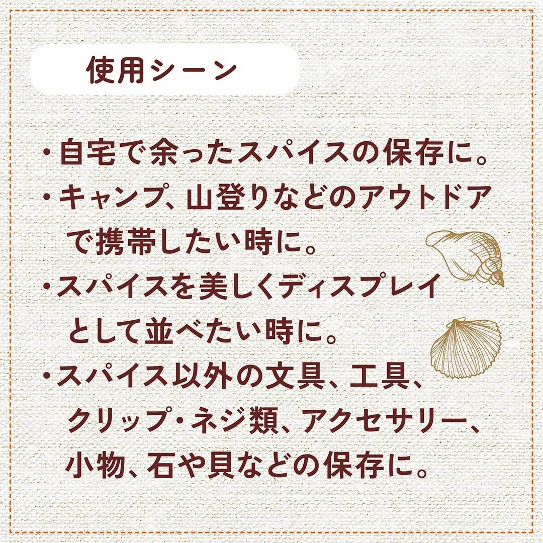 ・スパイス以外の文具、工具、クリップ・ネジ類、アクセサリー、小物、石や貝などの保存に。