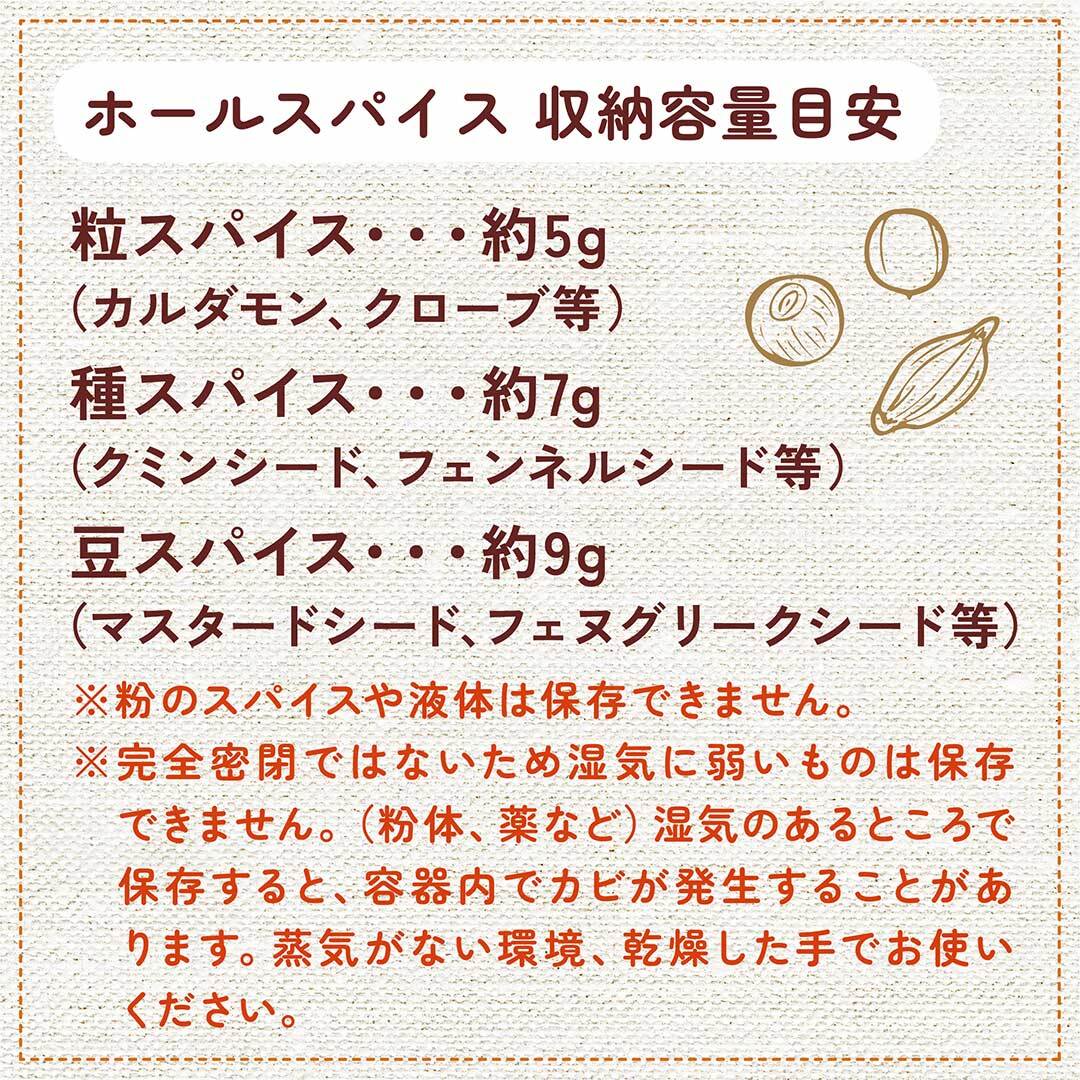 *注 粉のスパイスや液体は保存できません。湿気のあるところで保存すると、容器内でカビが発生することがあります。蒸気がない環境、乾燥した手でお使いください。