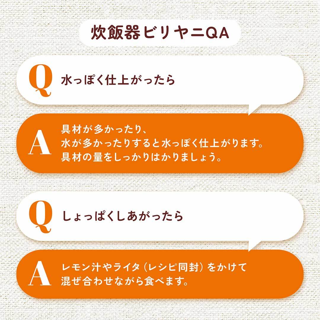 ビリヤニ作りでよくある質問Q&A(炊飯器の香りのケア方法、炊いた後の保存方法など)もまとめております。