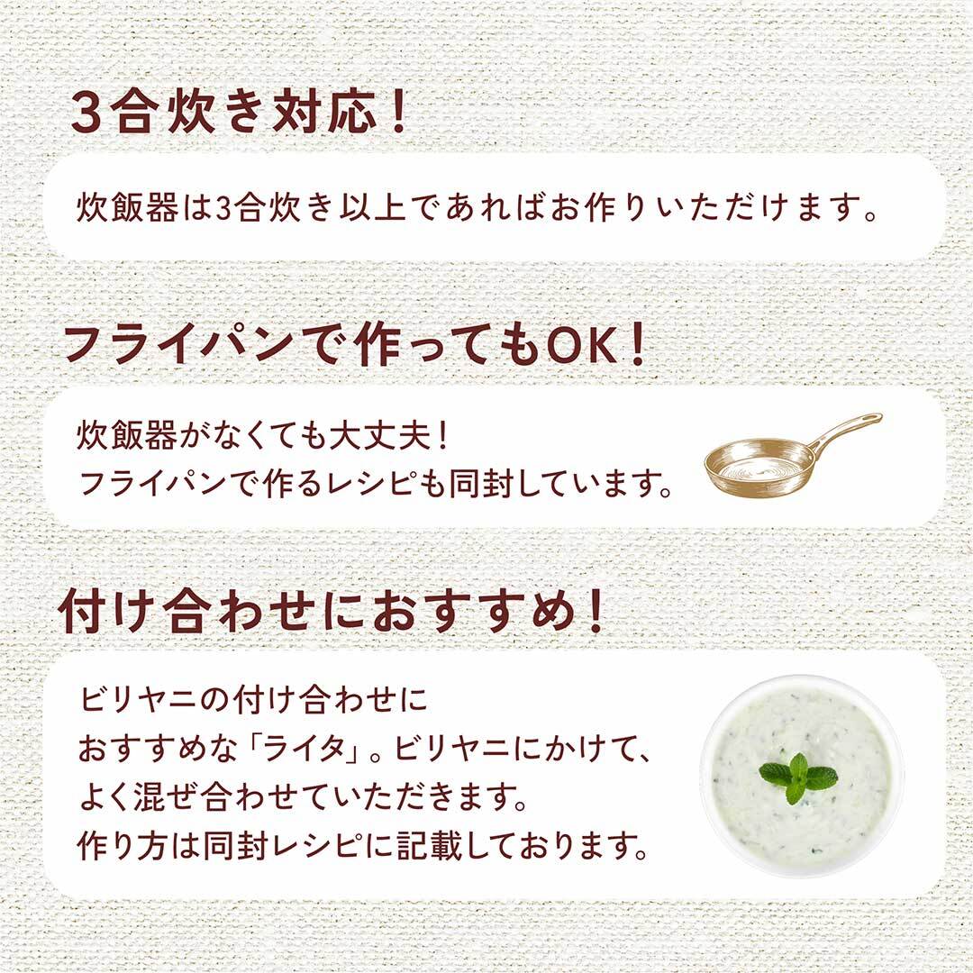 同封レシピにはチキンビリヤニのほか、ポークビリヤニ、副菜ライタの作り方のほか、フライパンで作る方法も掲載。